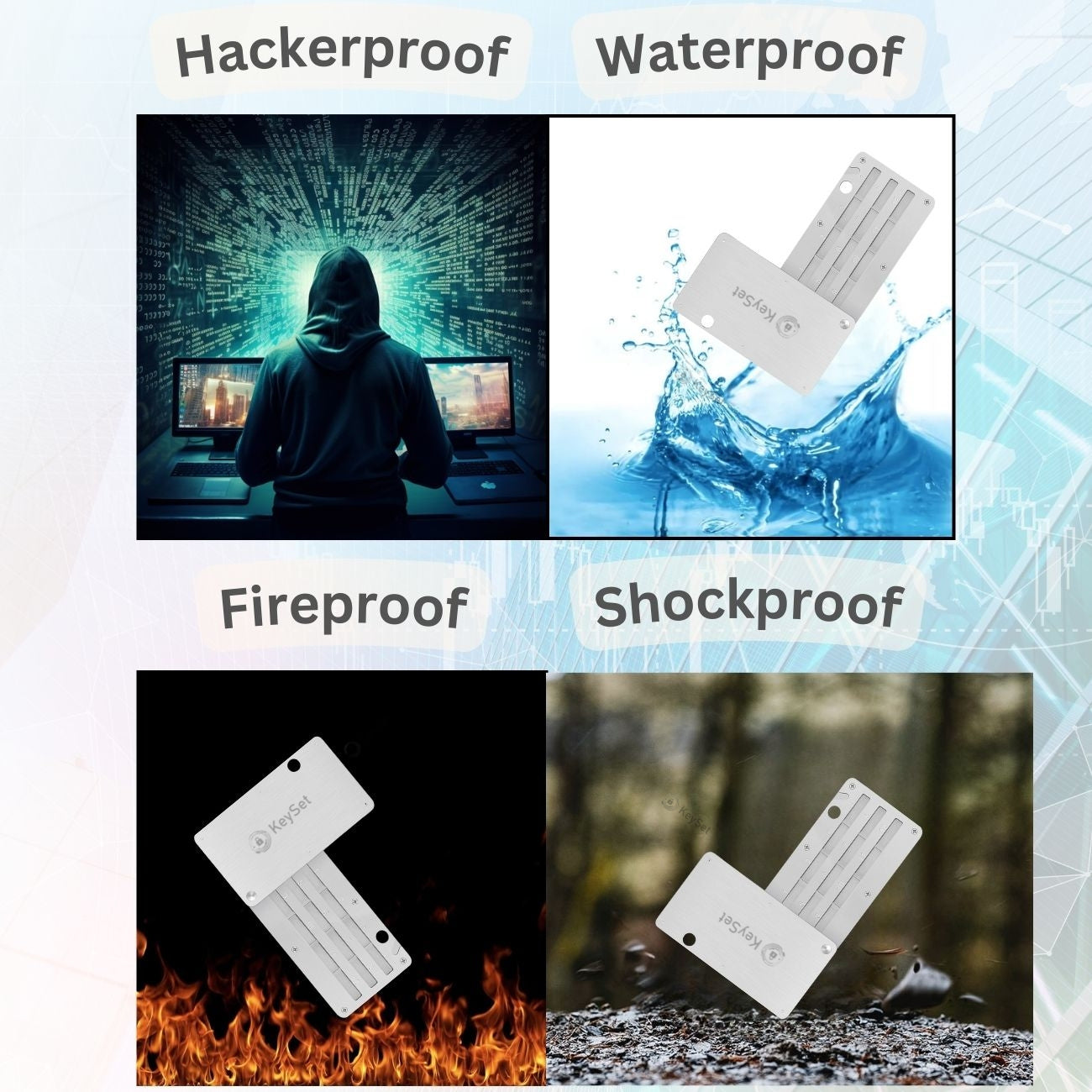 - KeySet Seed Phrase Stainless steel metal seed storage is virtually indestructible fireproof, waterproof, shockproof and Hackerproof, making sure your mnemonic is safe no matter what. Its compact size 10.5 cm x 6.0 cm makes it easy to carry in your pocket or purse, providing peace of mind wherever you go.